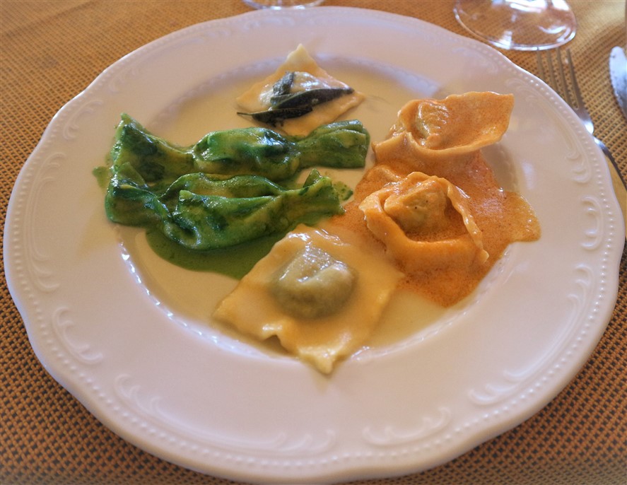 le tagliatelle fatte in case con funghi e pesto e i ravioli preparati in diverse versioni, a caramella o come pansotti, conditi con una salsa di peperone, o con il burro e salvia.