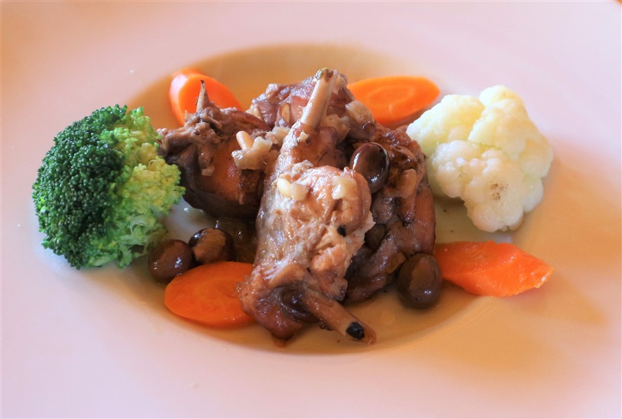Come secondo arriva il coniglio, tenero e gustoso, con verdure di stagione,