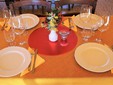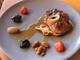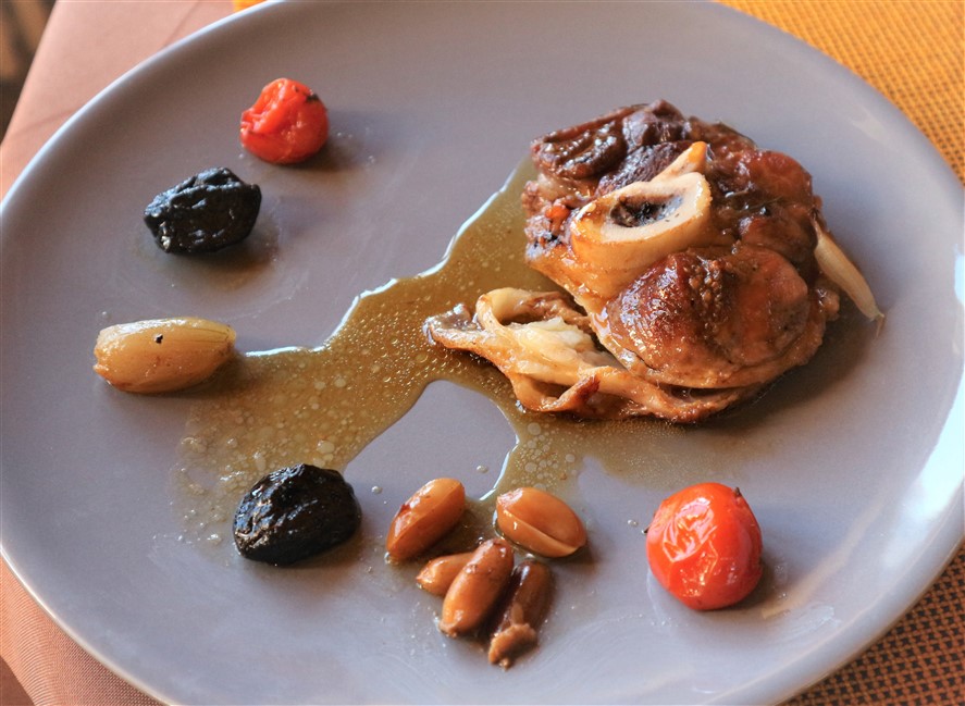 e ancora l'ossobuco circondato da prugne, anacardi cotti e pomodorini confit. Prima del dolce vi stupirà con un piatto di frutta abilmente intagliata come la mela trasformata in un elegante cigno ed altra frutta servita in modo speciale.