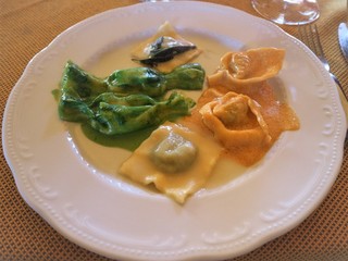 le tagliatelle fatte in case con funghi e pesto e i ravioli preparati in diverse versioni, a caramella o come pansotti, conditi con una salsa di peperone, o con il burro e salvia.