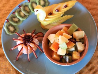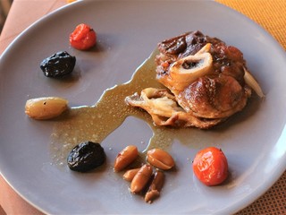 e ancora l'ossobuco circondato da prugne, anacardi cotti e pomodorini confit. Prima del dolce vi stupirà con un piatto di frutta abilmente intagliata come la mela trasformata in un elegante cigno ed altra frutta servita in modo speciale.