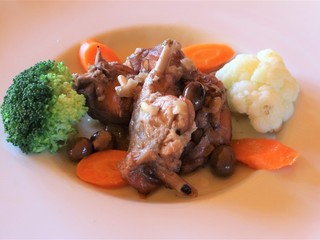 Come secondo arriva il coniglio, tenero e gustoso, con verdure di stagione,