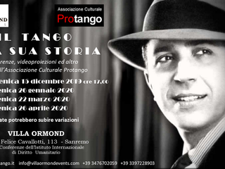 Domenica 26 gennaio, presso la Sala Conferenze dell'Istituto Internazionale di Diritto Umanitario di Villa Ormond, in Corso Felice Cavallotti 113 a Sanremo, alle ore 17.00, si terrà il secondo appuntamento dedicato alla divulgazione della cultura del Tango Rioplatense dal titolo ‘Il Tango e la sua Storia’ organizzato dall'Associazione Culturale Protango in collaborazione con Villa Ormond Events (ingresso libero).