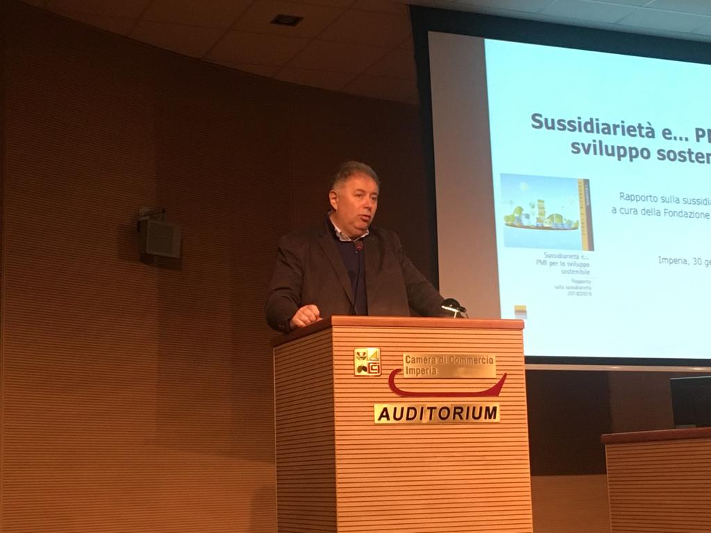 “Siamo alla  ripartenza di due anni fa, ha dichiarato il sindaco di Imperia, quando decidemmo di dare vita, nella competizione elettorale del comune di Imperia, a una formazione civica che parlasse dei problemi, che fosse nella concretezza spaesata di fronte a uno scenario politico molto confuso. Dopodiché abbiamo iniziato a fare un’attività amministrativa nella mia città, una città che amo e che mi pare stia muovendosi per recuperare quanto perso nel passato e ritornare a essere una bella città. Questo auditorium, quindi, era una buona occasione per parlare sempre di cose concrete, tanto più in tempi difficili con l’economia che langue, e quindi l’opportunità di un convegno per ascoltare il rapporto con la sussidiarietà e le piccole e medie imprese. Il professor Vittadini è uno dei personaggi più importanti della storia del nostro paese, per la sua capacità, per la sua professionalità, per aver visto molto per tempo il futuro del nostro paese. E insieme a lui, con l’europarlamentare che abbiamo contribuito a eleggere, l’onorevole Salini che è un parlamentare europeo di spessore, al quale ci rivolgiamo anche per avere attenzioni sul nostro territorio in maniera positiva”.
