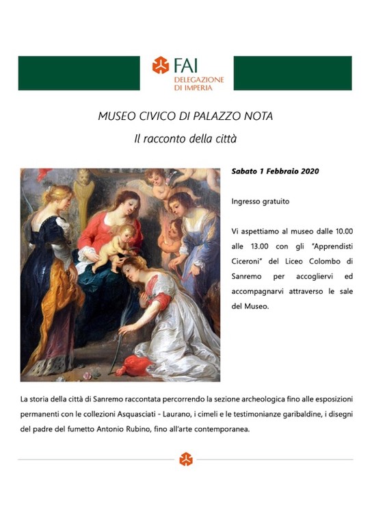 Prosegue anche nel 2020 la collaborazione tra la Delegazione FAI della provincia di Imperia e il Comune di Sanremo nell'ambito dei progetti di Alternanza Scuola-Lavoro per la valorizzazione del patrimonio storico-artistico della città e per la formazione culturale degli studenti sanremesi: il progetto 'Il museo Civico di Sanremo – Il racconto della città' è nato nell'autunno 2018 ed è continuato con successo durante il 2019; grazie ad esso anche quest'anno gli 'Apprendisti ciceroni' della classe 4°A scientifico del Liceo Colombo di Sanremo accoglieranno e accompagneranno i visitatori attraverso le sale del Museo Civico di Palazzo Nota, dalle ore 10 alle ore 13 di ogni primo sabato del mese, per raccontar loro la storia di Sanremo e del suo Museo e per aiutarli a conoscere gli importanti reperti e le collezioni che testimoniano le vicende di questa città plurimillenaria, a partire dalla sezione archeologica fino alle esposizioni permanenti: un viaggio attraverso i secoli dalla preistoria all'età contemporanea.