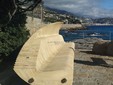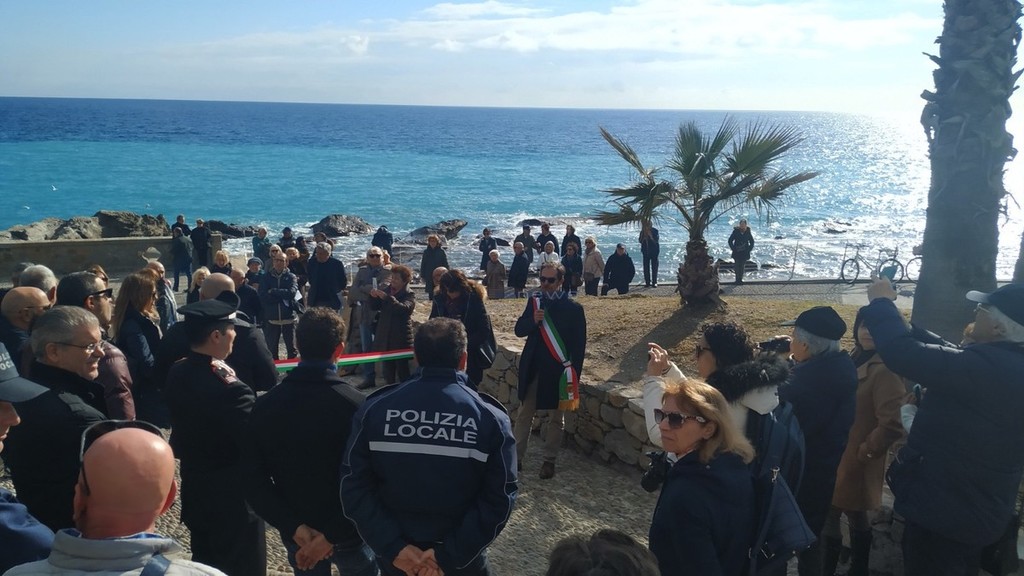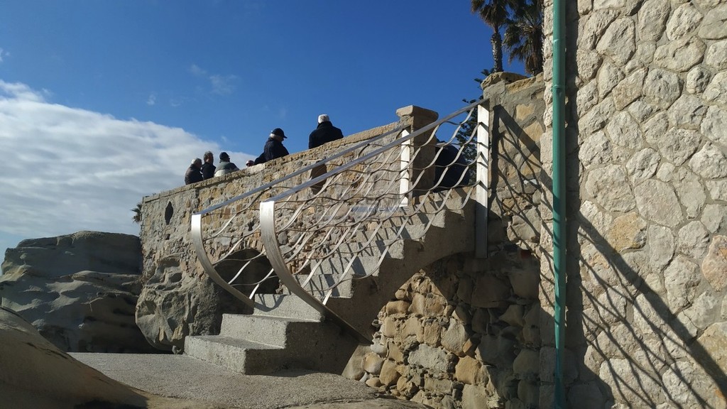 Grazie alla sapiente maestria degli architetti Panetta e Liotta l’antica arte tutta ligure del rissêu genovese, ovvero il mosaico in ciottoli, si fonde splendente nella raffigurazione della palma che protende fraterna i propri rami verso un concept artistico dal design nettamente più futuribile, riscontrabile nelle linee sfuggenti e morbide, sinuose come le onde del mare, che scolpiscono la panchina in legno. Le ringhiere in metallo sulle quali sono incisi i nomi degli scogli nel dialetto bordigotto scintillano al sole conferendo al luogo ulteriore luminosità.