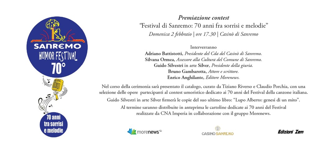 Al termine saranno distribuite in anteprima le cartoline dedicate ai 70 anni del Festival realizzate da CNA Imperia in collaborazione con il gruppo MorenewsNel corso della cerimonia sarà presentato il catalogo , curato da Tiziano Riverso e Claudio Porchia, con una selezione delle opere partecipanti al contest umoristico dedicato ai 70 anni del Festival della canzone italiana.