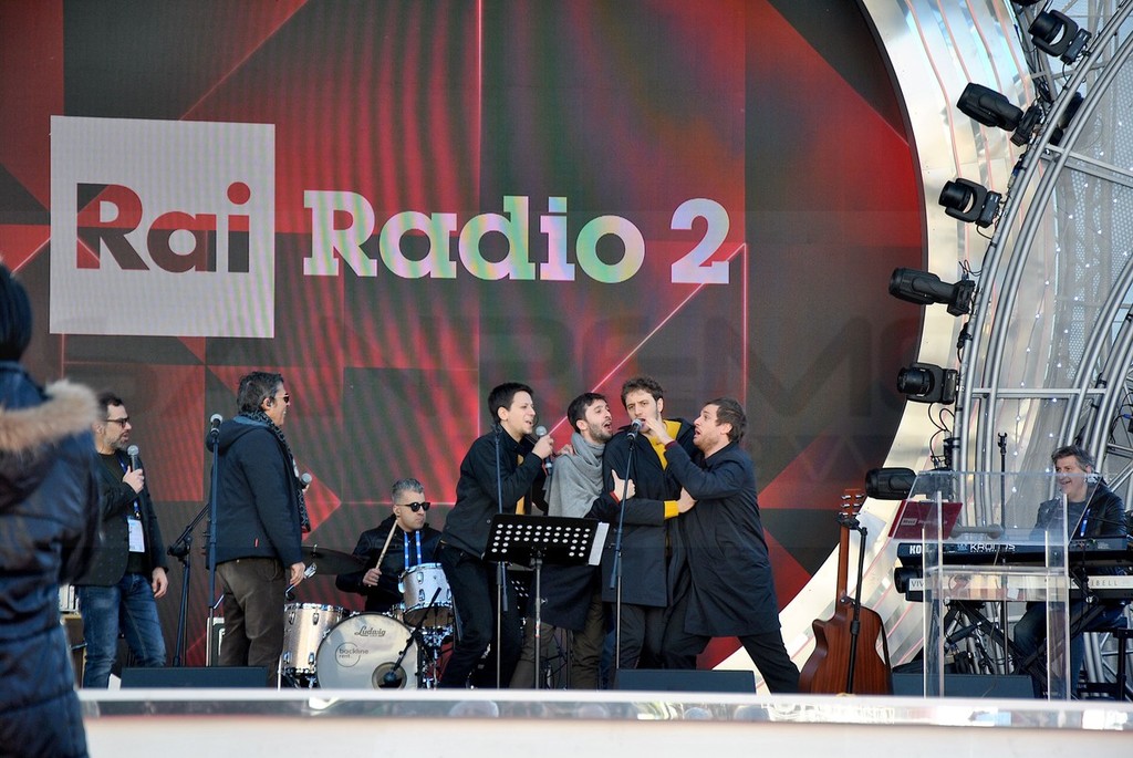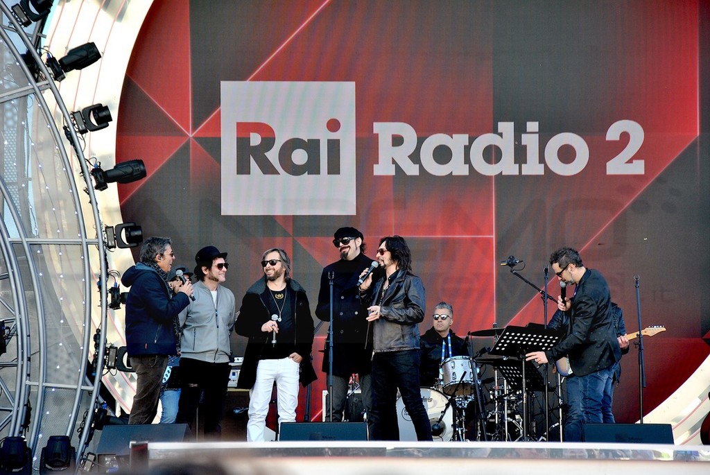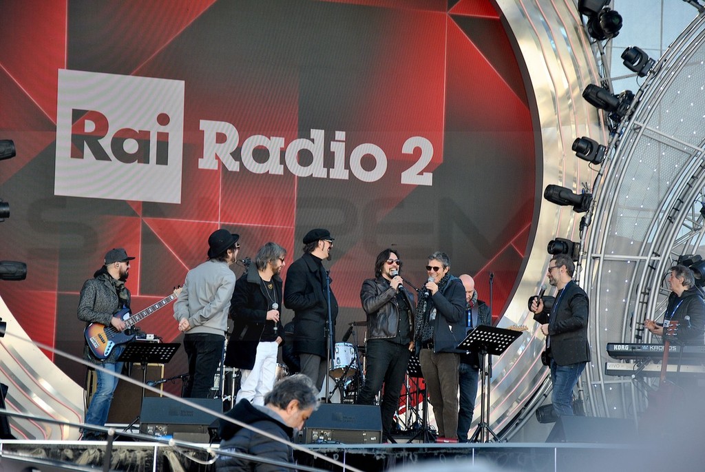 Le Vibrazioni, dopo il primo posto nella classifica provvisoria del Festival a margine della prima serata di kermesse, salgono sul palco di piazza Colombo per il collegamento in diretta su Rai Radio 2.