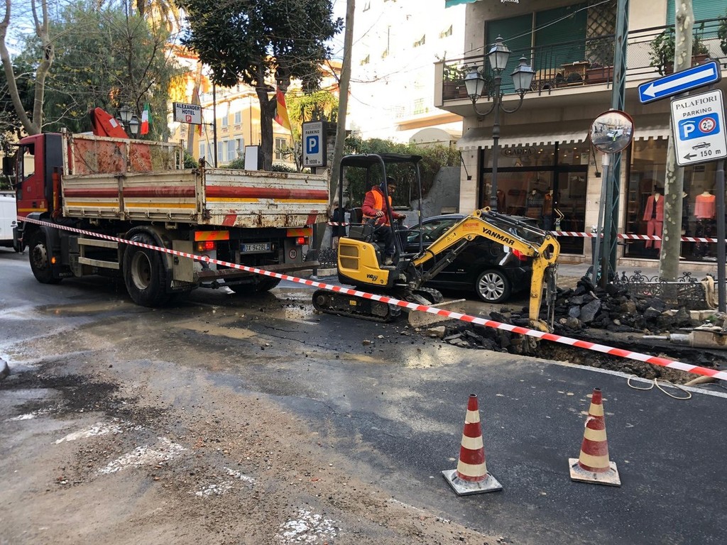Sanremo: esplode tubo in corso Garibaldi, case e negozi senza acqua da questa mattina. Strada chiusa al traffico (Foto e Video)