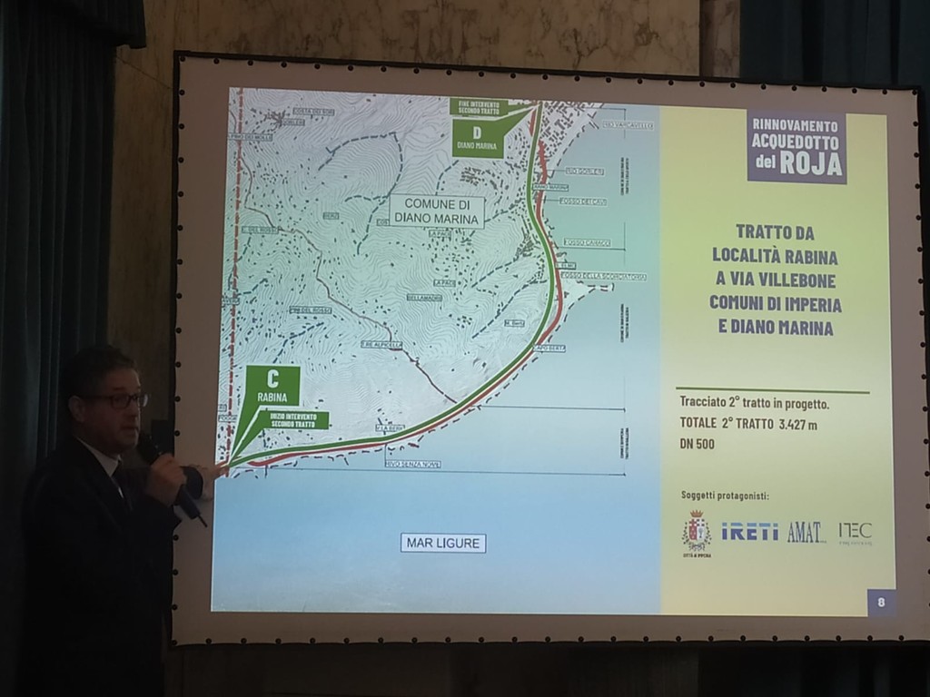 “Non ho portato nessuna perplessità, - ha poi spiegato il sindaco di Diano Castello Romano Damonte - ho solo ribadito quello che avevamo detto in tante riunioni: premetto che sono contentissimo che si riesca a raddoppiare il tubo e arriviamo a Diano Marina. Continuo a ribadire che l’importante è che arriviamo allo stacco di Diano Marina, poi che si inizi da un punto o da un altro l’importante è che arriviamo a quello. Noi del dianese abbiamo sempre puntato a quello, adesso non vogliamo fare la parte di quelli che pongono delle pastoie o che vogliono fermare l’opera. A noi sta bene che venga fatta, l’importante è che arriviamo al dianese. Noi conosciamo le problematiche del nostro territorio, del tubo che si rompeva nel nostro territorio, ho solo ribadito quello. Sono contentissimo che si faccia questo tratto di conduttura, l’importante è che arriviamo nel dianese in tempi abbastanza brevi perché quando sono iniziati questi discorsi, erano iniziati perché c’era la problematica del dianese che tutte le estati restava senza acqua. Forse Diano Castello l’ha patita meno avendo delle centrali di pompaggio e delle vasche di accumulo, però mi sono sentito in dovere di precisare queste cose. Poi, se abbiamo trovato il finanziatore e chi porta l’acqua nel dianese sono ben felice”.