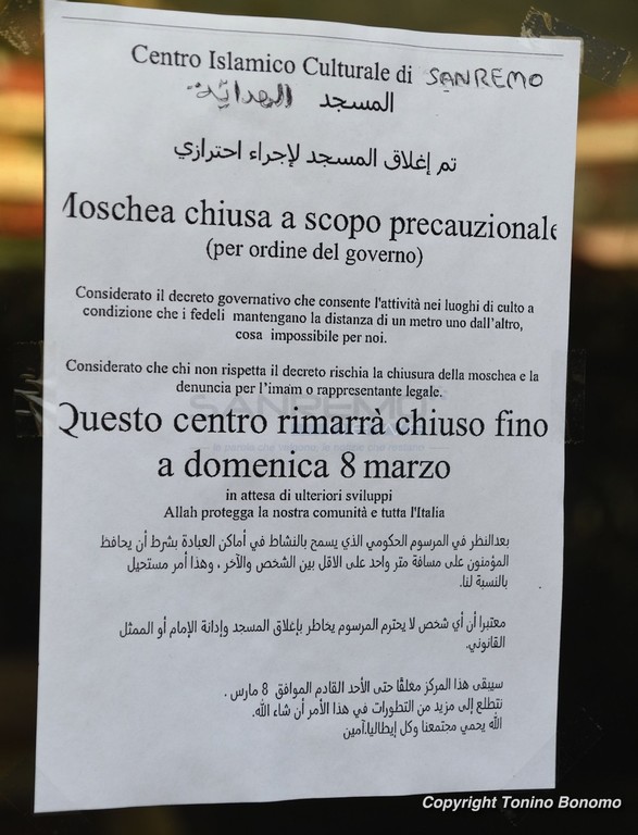 L'emergenza Coronavirus non conosce confini e, per fortuna, nemmeno barriere culturali e religiose. E così anche il centro islamico di Sanremo si è adeguato alle disposizioni di sicurezza chiudendo fino a oggi e prolungando poi la chiusura anche nei prossimi giorni come da disposizione comunale.