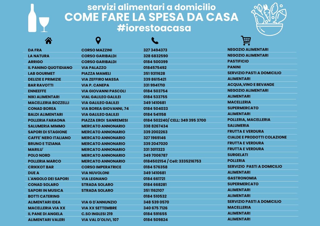 Alle sporadiche iniziative viste finora, si affianca l'organizzazione di un gruppo di commercianti di Sanremo che ha stilato una vera e propria lista, che alleghiamo all'articolo, di locali di generi alimentari, che già facevano, o che hanno iniziato adesso a fare le consegne al domicilio dei propri clienti.