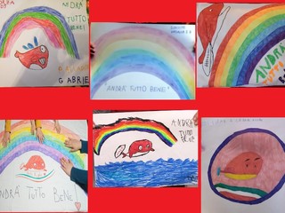 I piccoli del REDS rugby Team - IM usando i mezzi di comunicazione on line per mettersi d'accordo, si sono armati di pennarelli e quanto possa essere utile per sostenere e far sentire la vicinanza a tutti i loro amici e le loro famiglie ed ecco che vicino all'arcobaleno è stata posizionata la mascotte, ormai nota, balenottera rossa ed il capolavoro è fatto.