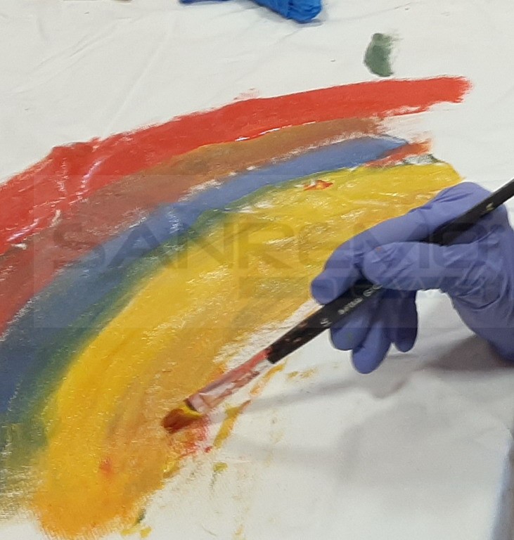 Il cartellone, esposto all’esterno della sede è un'idea che parte dall'utenza, dal bisogno di mantenere i contatti, di farsi sentire, di far sapere che siamo uniti e vi pensiamo. È stato realizzato nell'attività artigianale, con l'uso di tempere, pennelli, spugne, teli di stoffa. Un’attività di gruppo che ha coinvolto molti e nella quale si sono divertiti a sperimentare colori, materiali e tecniche insieme.