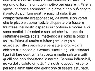 "Amici, queste sono le immagini di via Sestri a Genova questa mattina. Così proprio non ci siamo. Vorrei chiedere a questi sconsiderati cittadini- stigmatizza Toti- se davvero ognuno di loro ha un buon motivo per essere lì. Fare la spesa, andare a comprare un giornale non può essere il pretesto per fare quattro passi al sole. È un comportamento irresponsabile, da idioti. Non vorrei che le piccole buone notizie di queste ore fossero fraintese: nei nostri ospedali si continua a morire. E ci sono medici, infermieri e sanitari che lavorano da settimane senza sosta, mettendo a rischio la propria salute. Prima di uscire e infrangere le regole guardatevi allo specchio e pensate a loro. Ho già chiesto al sindaco di Genova Bucci e agli altri sindaci liguri di fare controlli a tappeto e multe salate a tutti quelli che non rispettano le norme. Saremo inflessibili, ne va della salute di tutti. Nei nostri ospedali ci sono persone ammalate che gioiscono di essere estubate, avendo comunque un casco per la ventilazione in testa, ve ne rendete conto? Vogliamo andare avanti così? Per uscire in sicurezza domani, dobbiamo rigorosamente stare a casa oggi. Non so più come dirlo!