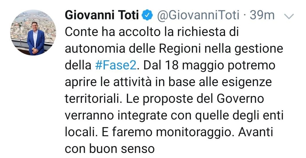 Come annunciato un'ora fa su Twitter, adesso il governatore ligure Toti ha confermato che il "Governo ha accolto le richieste di autonomia delle regioni. Dal 18 maggio potremo aprire le attività in base alle esigenze territoriali. In Liguria potranno quindi ripartire le categorie che aspettano da giorni risposte come: ristoranti, bar, negozi di abbigliamento, parrucchieri e centri estetici. Pertanto le proposte del Governo verranno integrate con quelle degli enti locali. E su questo faremo un attento monitoraggio. Come presidenti di Regione abbiamo anche chiesto che possano arrivare entro giovedì i protocolli, le linee guida che mancano per tutte le attività su cui stanno lavorando Inail e il comitato tecnico scientifico”.