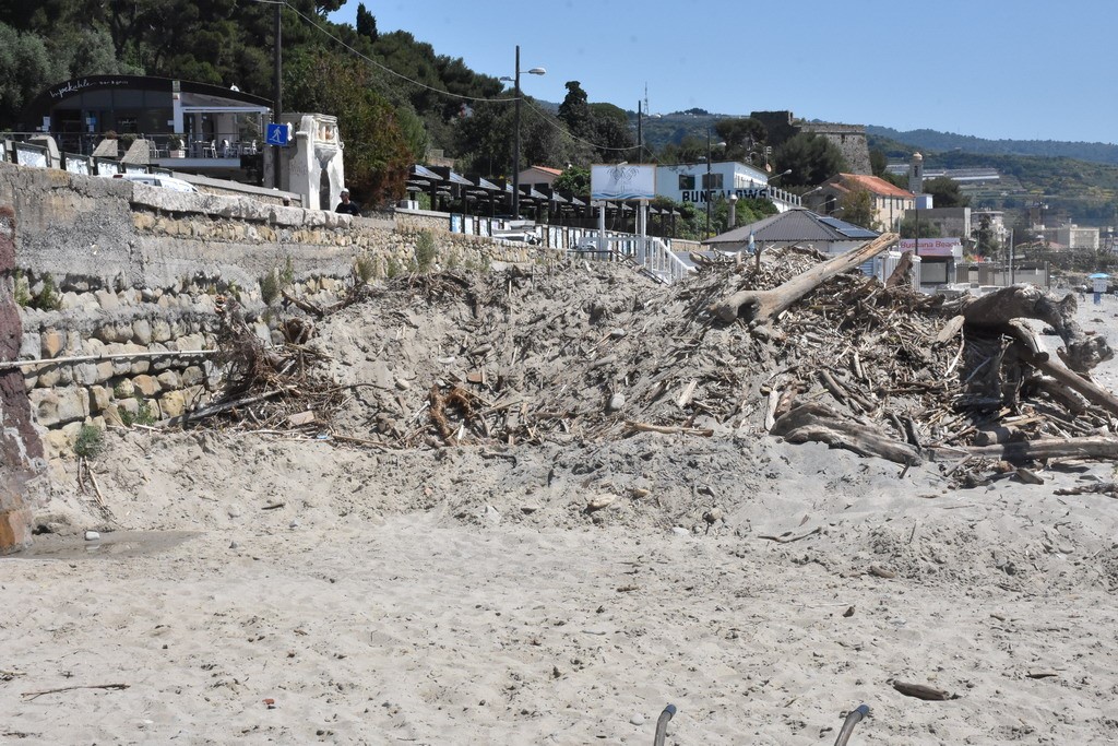 Il litorale di Bussana ancora parzialmente invaso dai tronchi e materiale ligneo in genere che, in occasione delle giornate di maltempo a dicembre e gennaio, si è ‘spiaggiato’ sull’arenile.