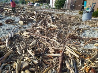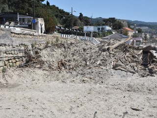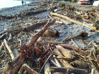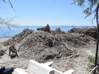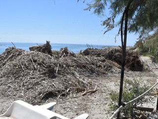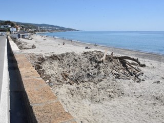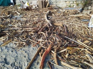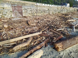 Il litorale di Bussana ancora parzialmente invaso dai tronchi e materiale ligneo in genere che, in occasione delle giornate di maltempo a dicembre e gennaio, si è ‘spiaggiato’ sull’arenile.