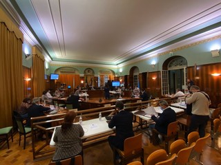 Le postazioni sono state organizzate in modo che tutti i consiglieri fossero distanziati con una sistemazione che ha sfruttato anche parte dell'area solitamente destinata al pubblico, oggi assente. Per i consiglieri 'sfrattati' dalla loro postazione originaria sono stati messi a disposizione microfoni comuni igienizzati ad ogni intervento.