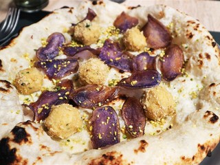 La pizza vegana "Zelante", con polpettine di ceci, chips di patate viola e pistacchi