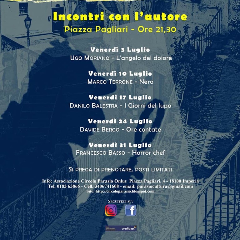 Da venerdì 3 luglio fino a venerdì 31 luglio, nell'incantevole cornice di Piazza Pagliari, ci saranno incontri con i seguenti autori: Ugo Moriano, Marco Terrone, Danilo Balestra, Davide Bergo, Francesco Basso.