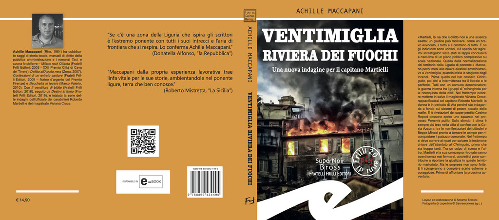 Segnalato dal quotidiano “La Repubblica” tra i libri dell’estate 2020, il romanzo “Ventimiglia riviera dei fuochi” completa la prima trilogia criminale del ponente ligure (iniziata nel 2018 con il romanzo “Il venditore di bibite”, e seguita nel 2019 con “Destini in fumo”). Un noir di inchiesta che si sviluppa attraverso un culmine di vicende crude e incalzanti: i disordini in città e nella frazione Latte, il super testimone pentito di ‘ndrangheta Cosimo Repaci che ha conosciuto e frequentato, durante la latitanza, la banda di don Mimmo Pace, i tentativi di ricostituzione di un nuovo gruppo malavitoso a Ventimiglia, il processo Ponente pulito a Imperia, le elezioni comunali e le operazioni di voto di scambio.