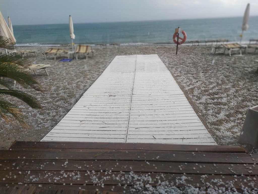 Maltempo oggi sul ponente: ecco la grandine in riva al mare sulla spiaggia di Bussana (Foto)