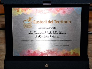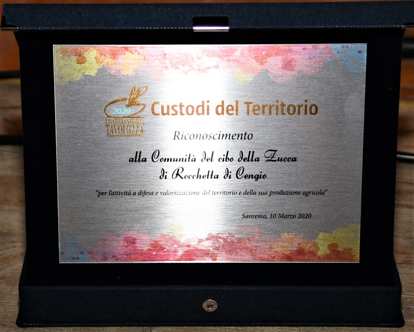 Dopo la presentazione del libro è stata consegnata dal Sindaco la targa di Custodi del Territorio a Giampietro Meinero, responsabile della Comunità Zucca di Rocchetta di Cengio, che ha donato all’amministrazione comunale una zucca realizzata in vetro di Altare da un artigiano della Valle Bormida. La targa Custodi del Territorio promossa dall’Associazione Ristoranti della Tavolozza è stata attribuita per l’attività della Comunità di Rocchetta nella promozione e difesa delle tradizioni locali, unite ad un particolare impegno diretto a vivere il territorio in modo più consapevole e responsabile.