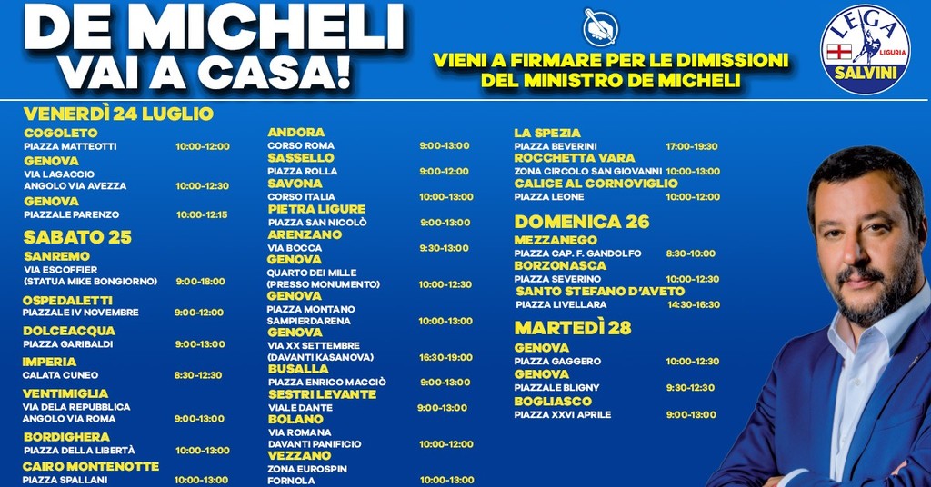 Da oggi fino a martedì 28 luglio la Lega organizza la raccolta firme in 30 Comuni della Liguria (elenco gazebo in allegato) per le dimissioni del ministro delle Infrastrutture De Micheli. “Chiederemo ai liguri – dice Edoardo Rixi, segretario della Lega Liguria e responsabile nazionale Infrastrutture - cosa ne pensano di un ministro che li tiene in ostaggio da settimane, che non ha saputo programmare la gestione dei cantieri di manutenzione e che, non contenta, viene a Genova a dare dei bugiardi a imprenditori, lavoratori del porto, dell’autotrasporto, del commercio e dell’industria come se si fossero inventati tutto con una ‘narrazione sbagliata’. Intanto la realtà, che il ministro non sa o non vuole vedere, è che anche oggi ci sono chilometri di coda su tutta la rete autostradale del nodo di Genova e ripercussioni anche sul traffico cittadino per il dirottamento dei mezzi pesanti e pullman dalla A26 alla A7: altro che narrazioni sbagliate!”.
