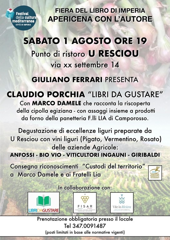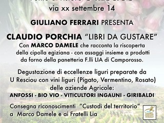Alla Fiera del Libro di Imperia sabato prossimo, alle ore 19.00, al punto di ristoro 'U Resciou' di via XX settembre 14, si terrà l' incontro con l’autore Claudio Porchia e la rassegna Libri da Gustare condotto da Giuliano Ferrari e con la presenza dell’agricoltore Marco Damele.