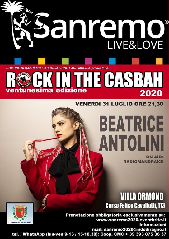Si parte venerdì 31 luglio con Rock in the Casbah che ospiterà sul palco di Villa Ormond Beatrice Antolini, cantautrice con all’attivo sei album, polistrumentista e turnista di Vasco Rossi, direttrice d’orchestra per Achille Lauro al 70° Festival di Sanremo.