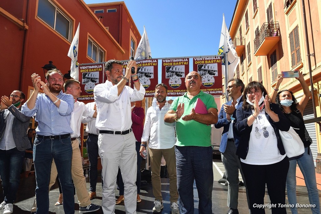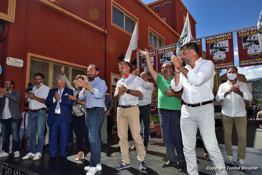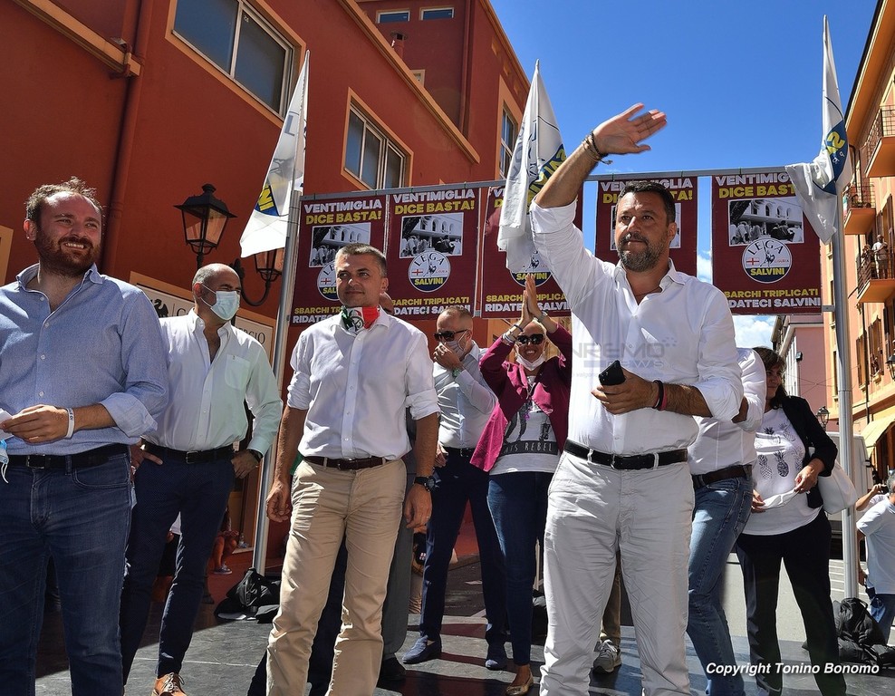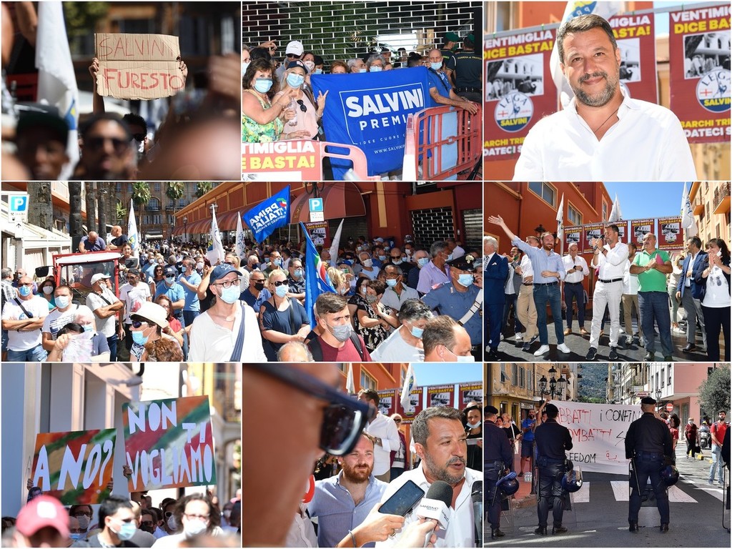 A Ventimiglia è stata la giornata della visita di Matteo Salvini. Il leader della Lega ha incontrato la cittadinanza parlando dal palco di via Aprosio e non sono mancati i contestatori che hanno fischiato per tutta la durata del suo intervento. Da sottolineare anche la totale mancanza di distanziamento tra il pubblico e le mascherine che per molti ormai sono diventate un optional.