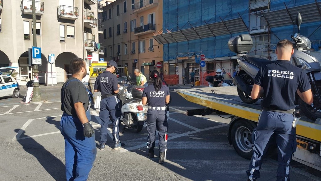 Imperia: blitz della polizia municipale in via Novaro, rimossi e multati gli scooter parcheggiati vicino al cantiere di piazzale Cristino (foto)