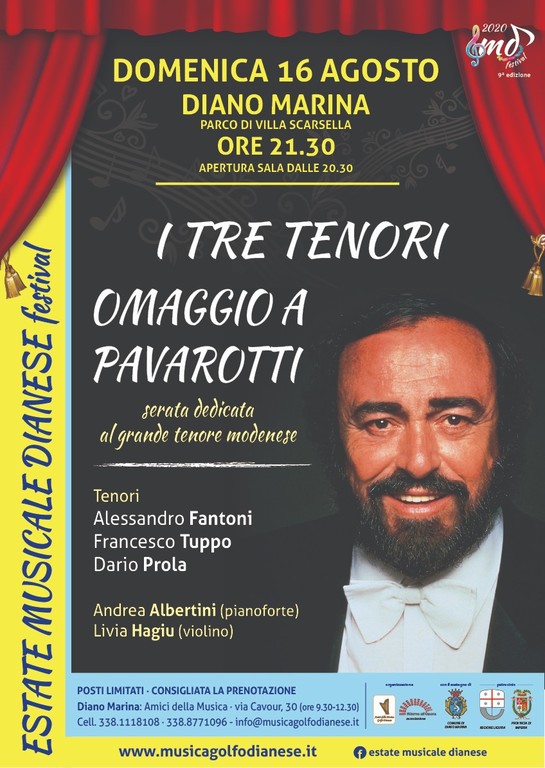 Dopo la magica serata dedicata ad Ennio Morricone, il cartellone del 9° Estate Musicale Dianese Festival di Diano Marina prosegue con un altro appuntamento in ricordo di un grande artista. Domenica 16 agosto (ore 21.30) a Villa Scarsella andrà in scena l'Omaggio a Luciano Pavarotti, con il concerto intitolato "I tre tenori". La suggestiva location sarà teatro di una vera e propria hit parade della musica vocale con uno spettacolo che non mancherà di affascinare non solo il pubblico, ma anche gli stessi protagonisti.