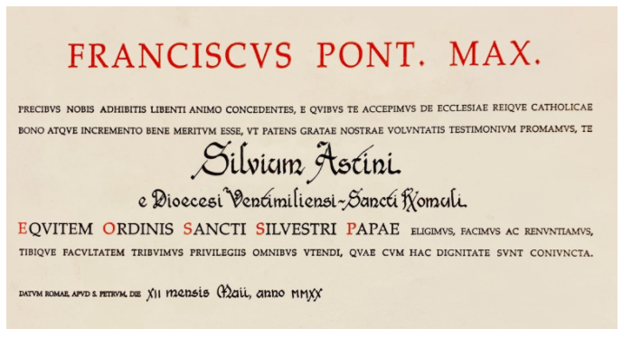 Ieri a Ventimiglia, il Rag. Silvio Astini è stato nominato Cavaliere dell’Ordine di San Silvestro Papa. La nomina gli è stata consegnata nella Chiesa Cattedrale di Ventimiglia alla fine del Pontificale di San Secondo. Astini è l'incaricato Diocesano per il sostegno economico alla Chiesa Cattolica, Volontario alla portineria dell’episcopio e Collaboratore dell’Ufficio per la Pastorale dello Sport, per la Diocesi di Ventimiglia Sanremo.