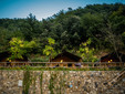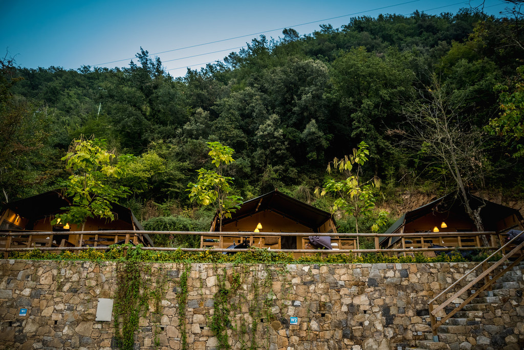Si parte da una dimensione particolare: non lontano da celebrate mete turistiche di mare. E' però immerso in uno scenario naturale sorprendente. Una valle che si restringe, tanto verde, un torrente fresco, le montagne possenti per uno sguardo verso il cielo. All’interno di un campeggio dotato comunque di spazi destinati a tende e camper, si incontra un vero e proprio villaggio.