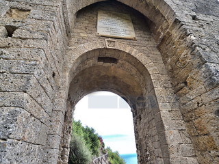 È un bell'esempio di costruzione difensiva, ottimamente conservata, su un terreno instabile. Eretta intorno al XII secolo, si presenta fortificata da una robusta torre sovrastante che ospitava un avamposto militare genovese. È situata nella parte occidentale della città, fuori dalle mura di cinta, dove controllava una posizione strategica, sul mare e sull'antica strada romana, la via Julia Augusta.