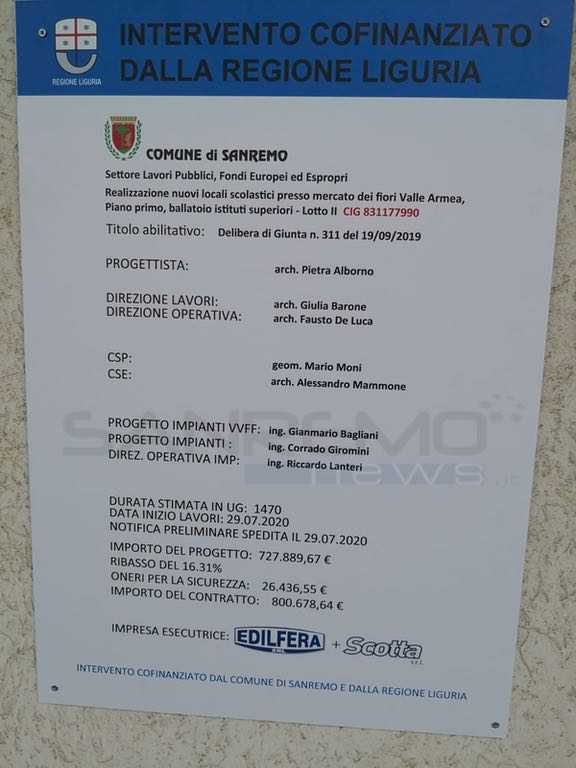 Questa mattina a Sanremo, sopralluogo al Mercato dei Fiori per verificare lo stato dei lavori nelle nuove aule che da lunedì ospiteranno l'Istituto Ruffini Aicardi. Il sindaco Alberto Biancheri, accompagnato dall'amministrazione comunale, dai tecnici del Comune, insieme alla dirigente scolastica, la dott.ssa Maria Grazia Blanco, hanno controllato i locali dove sono stati effettuati i lavori realizzati dalla R.T.I., composta dalla ditta sanremese Edilfera e dalla ditta cuneese Scotta.