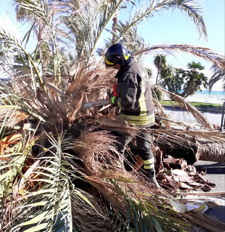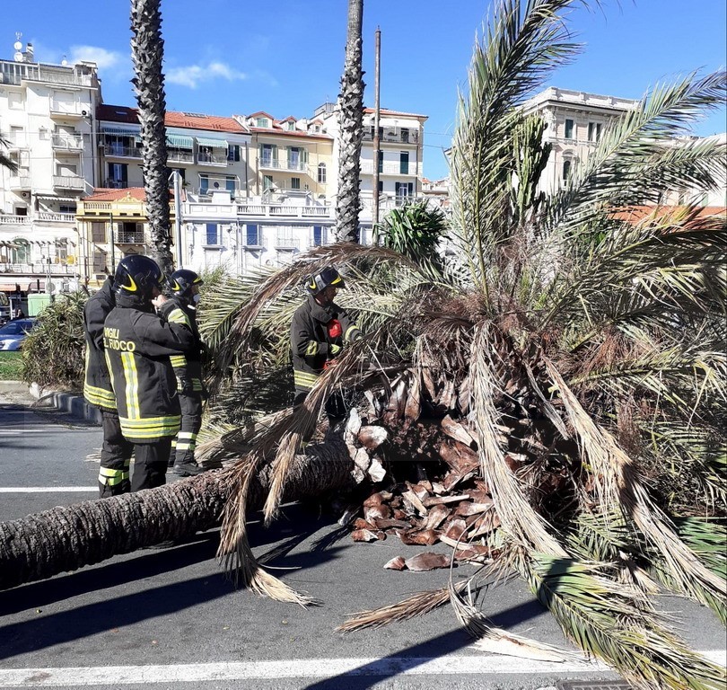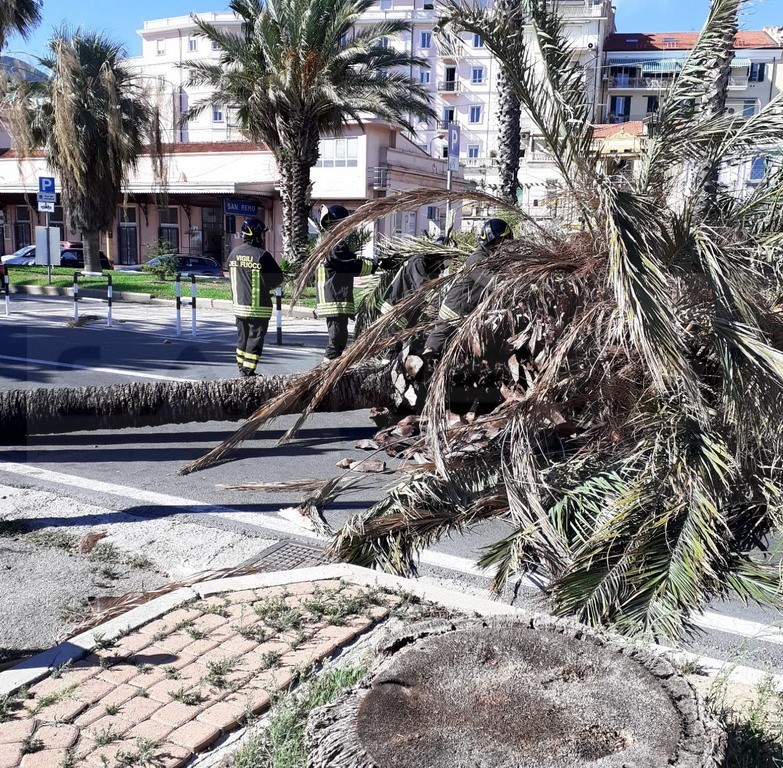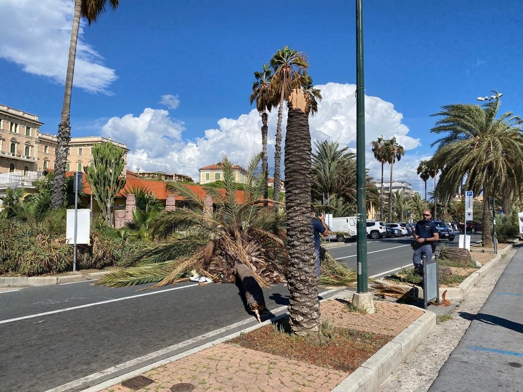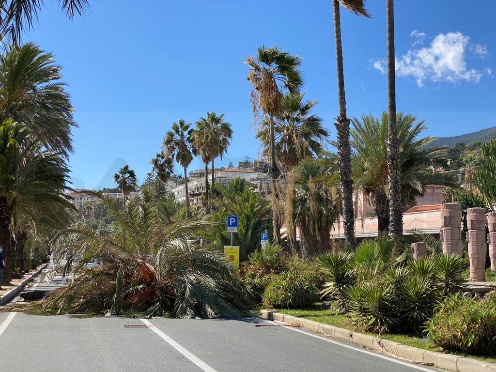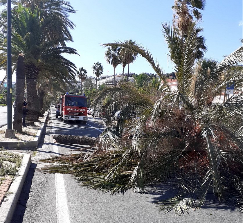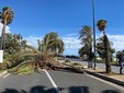 Sanremo: forte vento su tutta la provincia, cade una palma sul lungomare Calvino e strada chiusa