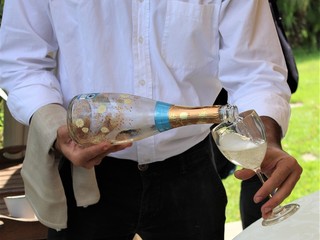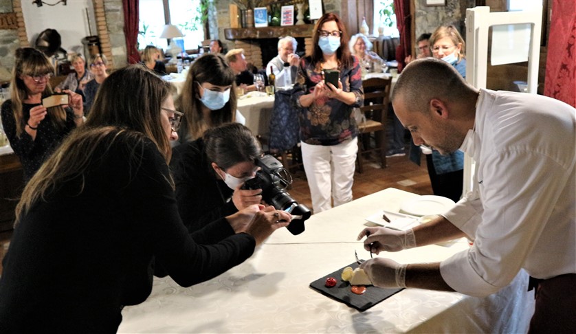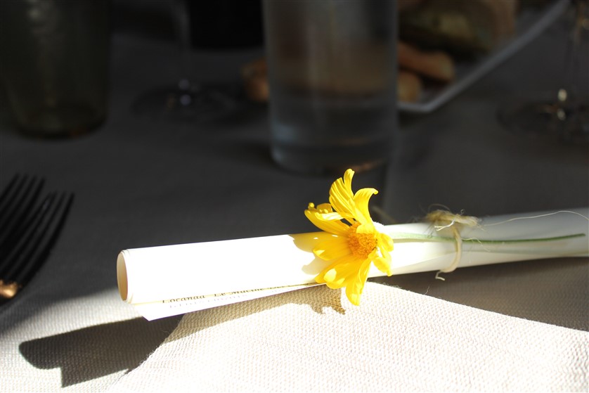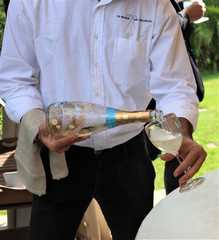 Aperitivo con una fragrante e gustosa focaccia con i fiori di Rosmarino, accompagnata con il gradevole e profumato Asti Secco Acquesi della cantina Cuvage di Acqui Terme, di cui sono state apprezzate anche le bottiglie decorate con i fiori.