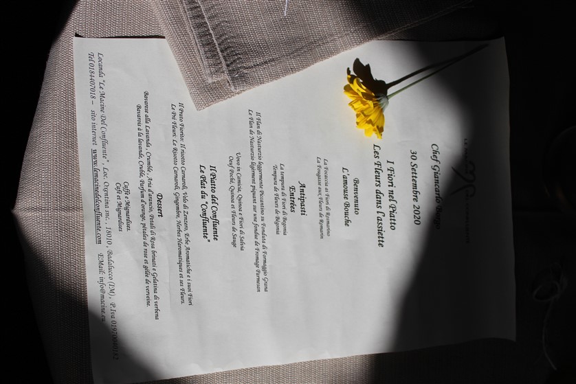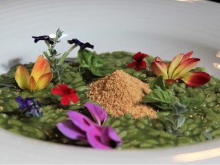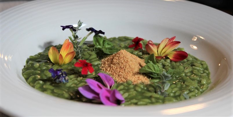 Come piatto principale un classico della cucina con i fiori delle Macine, Il “prato fiorito”, un risotto carnaroli, con velo di zenzero, erbe aromatiche e fantasia di fiori