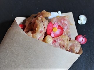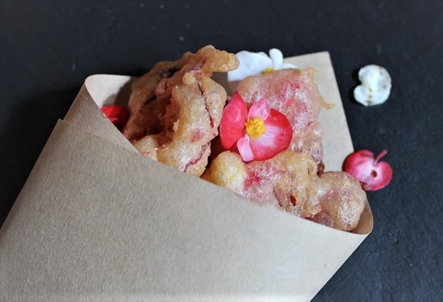La tempura di fiori di Begonia, caratterizzata dal gusto croccante ed acidulo insieme di questo fiore molto amato dagli chef
