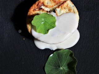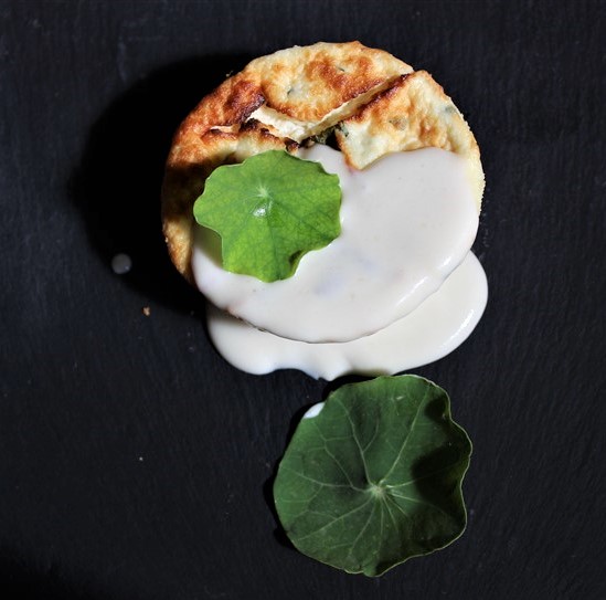 Il flan di Nasturzio piccantino su fonduta di formaggio grana