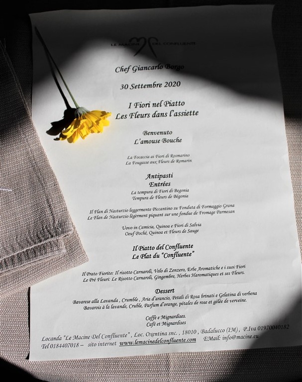 Dopo molte parole sulla cucina con i fiori, il pubblico ha potuto apprezzare una degustazione preparata dallo chef Giancarlo Borgo e realizzata con fiori freschi del vivaio Ravera Bio di Albenga, che garantisce una grande varietà di fiori, sempre freschi e prodotti in assoluta sicurezza alimentare, perché è bene ricordare che solo i fiori coltivati biologicamente possono essere portati in tavola.