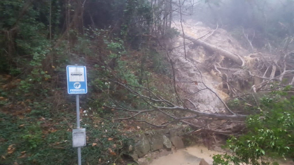 Provincia al lavoro per liberare le strade dell'entroterra flagellate dal vento, frana sulla Sp3 a Cosio d'Arroscia