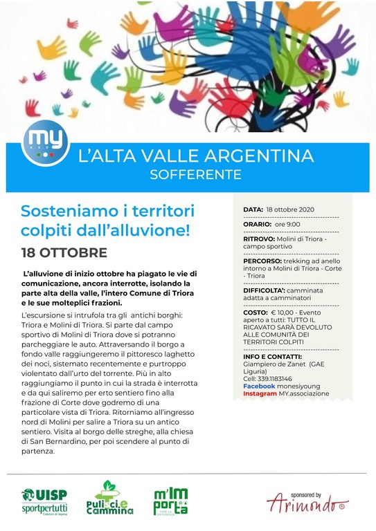 Tutti in questo momento: dalle istituzioni, alle associazioni, fino ai singoli privati si stanno dando da fare per sostenere le comunità custodi del nostro entroterra. Allo stesso fine l’associazione Monesi Young A.S.D., che fonda i suoi principi statuari nella valorizzazione, tutela e sviluppo sostenibile del territorio, intende sostenere i territori colpiti, promuovendo delle attività escursionistiche per il week end 17-18 ottobre e una raccolta fondi. Tutto il ricavato sarà devoluto alle comunità dei territori colpiti in valle Argentina, valle Arroscia e valle Tanaro.