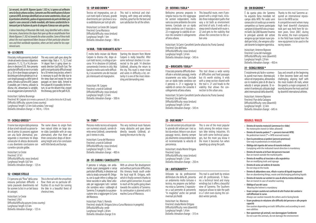 Gli elaborati sono stati analizzati e votati favorevolmente per una seconda volta dalla giunta matuziana e, ora, sono pronti per essere messi in pratica. I sentieri interessati sono: Le Creste, Scogli Grossi, Cinque Stelle, Up and down, Tubi variante alta, Tubi, St.Carini - Cancelletti, Bevino - Isola, Bruciato - Isola, Due Muri, Antigravity, DH Bignone e Scogli Rossi. Si dividono tra percorsi di cross country, enduro e downhill. I tracciati saranno identificati con cartelli e, soprattutto, regolamentati per evitare, ad esempio, i passaggi indesiderati delle moto.