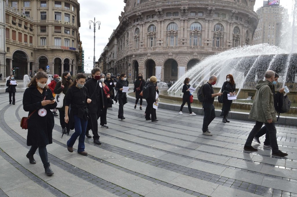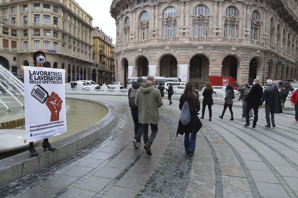 Ancora proteste contro la difficile situazione economica determinata dalla pandemia in pazza De Ferrari, e questa mattina è stato il turno dei lavoratori del comparto cultura e spettacolo, settore che ha subito uno stop dal lockdown generale di inizio 2020 mai del tutto scomparso.