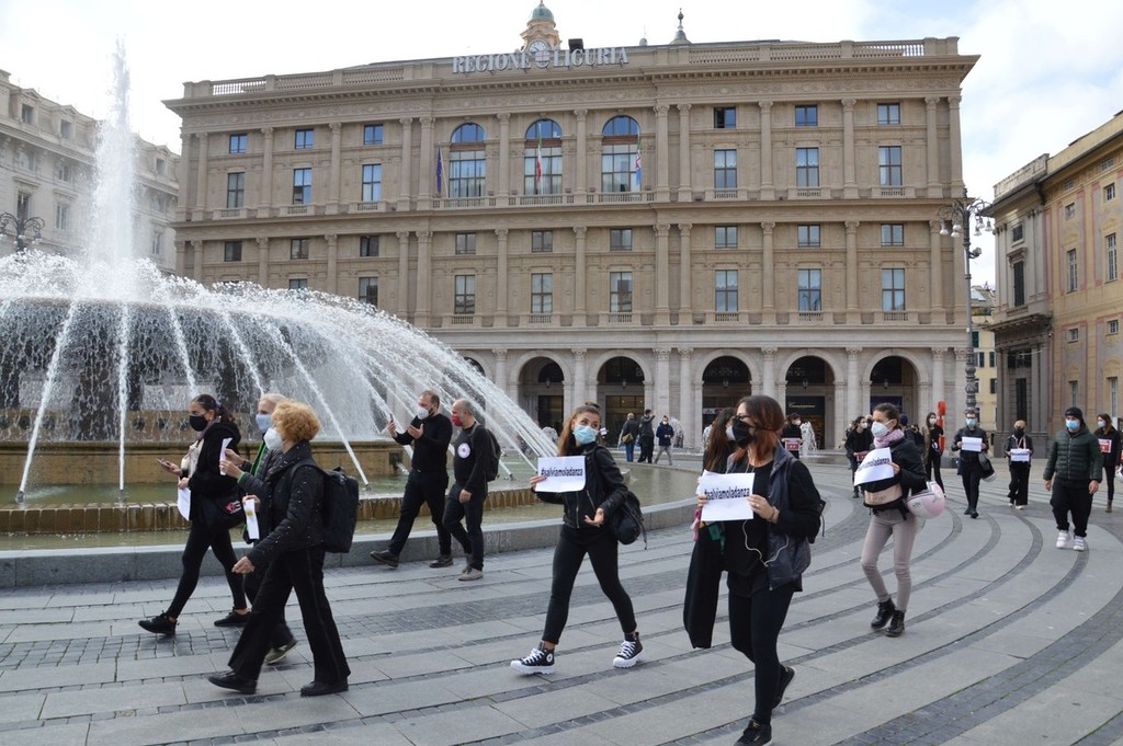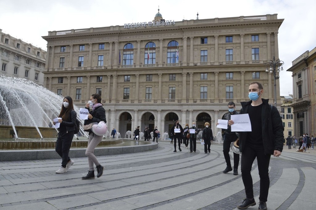 I lavoratori in piazza oggi, oltre che rivolgere un appello alle istituzioni affinché si prendano carico di mettere finanziariamente il settore in grado di sopravvivere, chiamano a raccolta da una parte i sindacati e le altre categorie produttive in difficoltà al fine di unire le forze per ottenere più attenzione da Governo, Regioni e Comuni: "Siamo qua innanzitutto perché diversamente che nel resto d'Italia in Liguria non è possibile manifestare, diritto che reclamiamo - spiega un lavoratore -. Abbiamo deciso questa iniziativa spontanea senza l'appoggio dei sindacati, ai quali chiediamo maggiore attenzione alle istanze dei lavoratori, per ricordare a istituzioni e cittadinanza come la nostra categoria abbia da subito messo in pratica tutele le misure necessarie per continuare a lavorare in sicurezza. Mentre la ristorazione è riuscita ad ottenere maggiore libertà di azione durante l'estate il nostro lavoro non è mai ripartito, ma ora che il coprifuoco colpisce le attività di somministrazione mi auguro ch le proteste non siano più settoriali. Io faccio sia il tecnico che il cameriere, e mi auguro che non si stia più chiusi nelle rivendicazioni che riguardano la propria categoria, ma che si lotti insieme avendo in mente il quadro d'insieme. Quest'emergenza sanitaria è diventata politica e sociale: vogliamo una riforma strutturale del settore dello spettacolo e della cultura. Non possiamo più accettare lo scarica barile politico fra i vari livelli di governo o fra la destra e la sinistra: vogliamo un dialogo vero oltre le fazioni e oltre le bandiere".