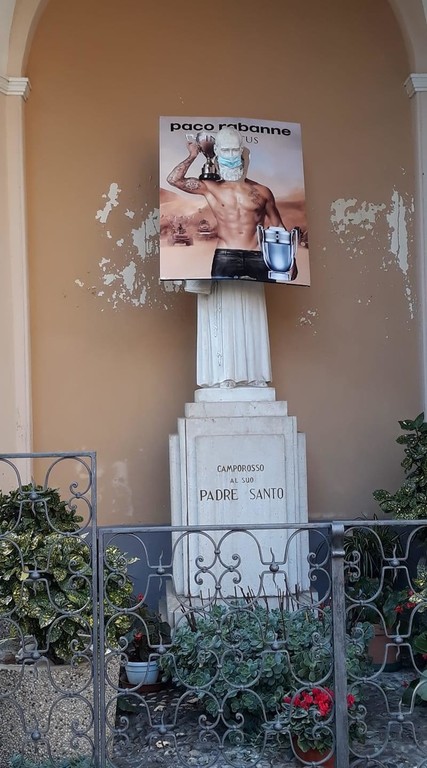 Camporosso: deturpata con un manifesto e una mascherina la statua del Padre Santo (Foto)